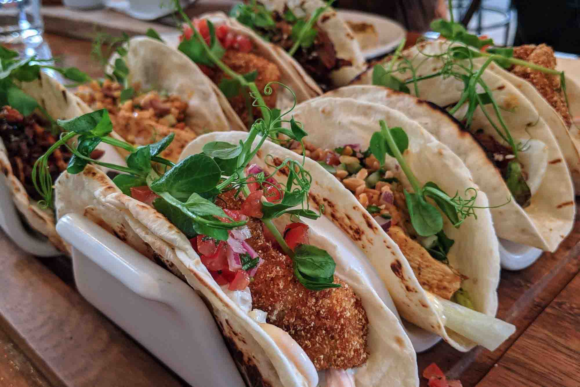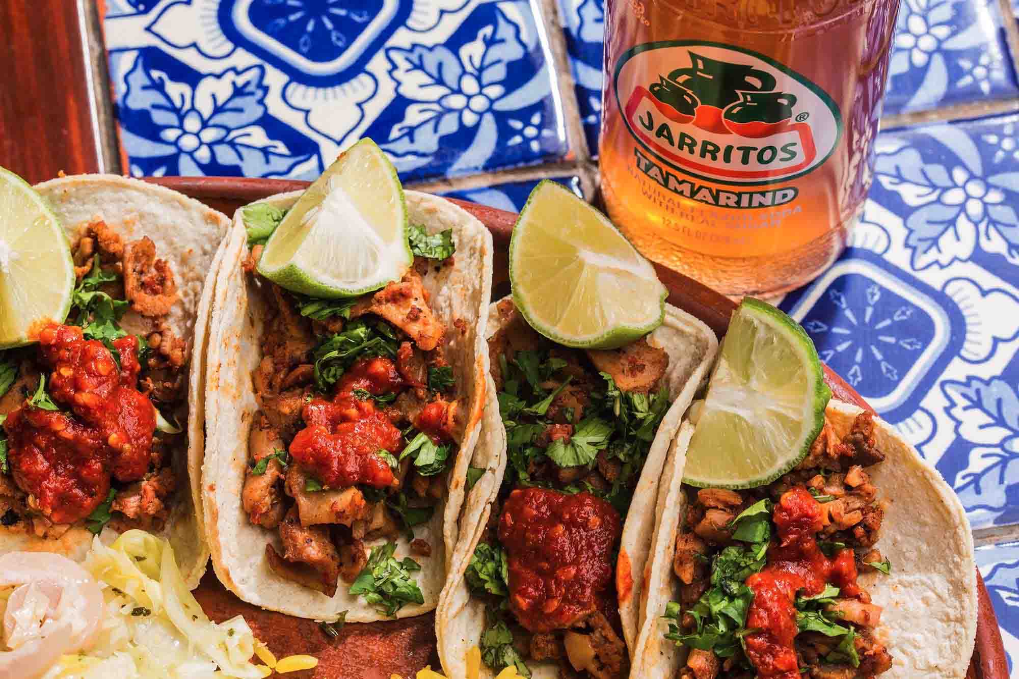 Find MoreThree fried tilapia tacos on a soft corn tortilla, topped with red cabbage, pico de gallo, and chipotle sauce. Served with Mexican rice and black beans.